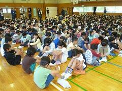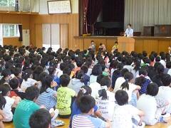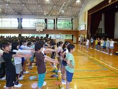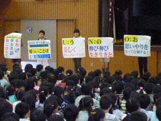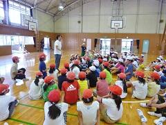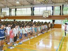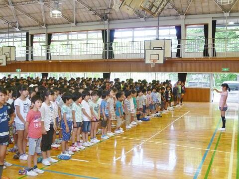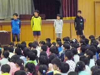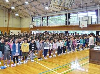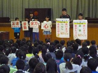 代表児童の元気なあいさつで、「全体朝会」が始まりました。