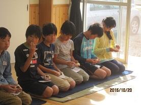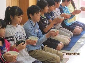 初めて体験する子ども達は、多少緊張ぎみながら、茶席の落ち着いた雰囲気の中で茶道を体験することができました。講師の小口先生からは、お菓子のいただき方や喫茶の作法など茶道についての一つ一つの作法を子どもたちに分かるように説明くださいました。また、掛け軸の「日々是好日」についての意味や礼儀を重んじながら客をもてなすお話もありました。子どもたちの体験活動では、初めて茶筅を使って抹茶を立てることは児童にとって難しいようでしたが、講師の先生方のご指導で、上手に泡を立てることができ、おいしくいただくことができました。