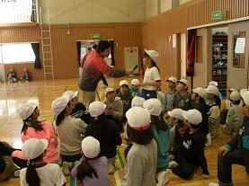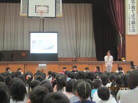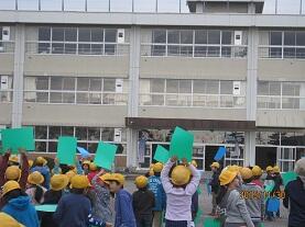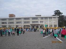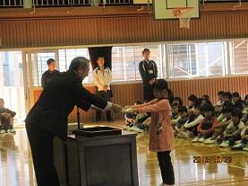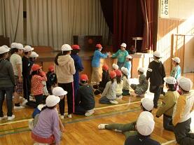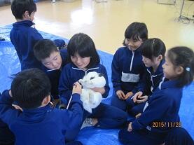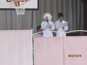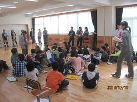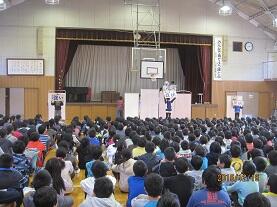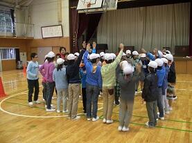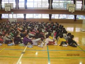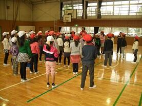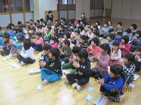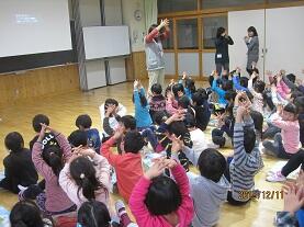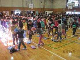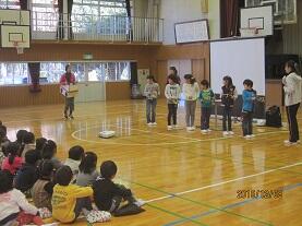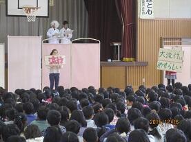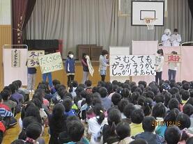 最後に、来年の干支の“さる”の着ぐるみを着た5年生が登場しインフルエンザ予防の「寒くてもガラガラうがいしっかり手洗い」を確認して締めくくりました。