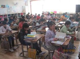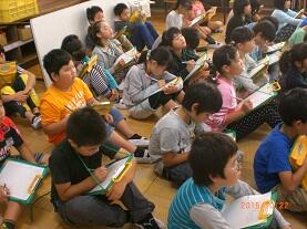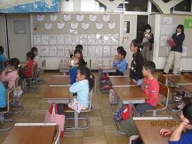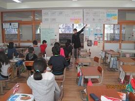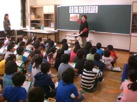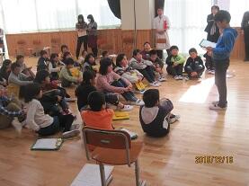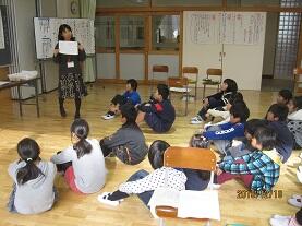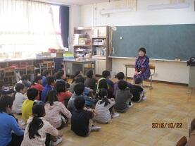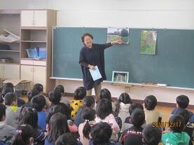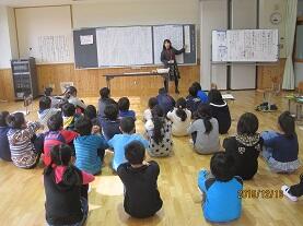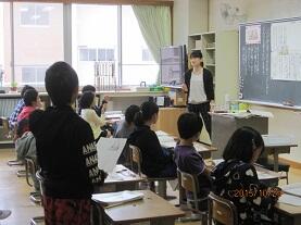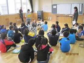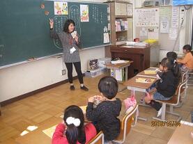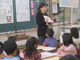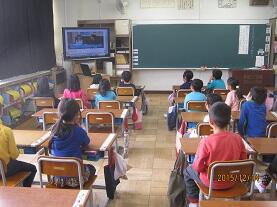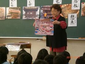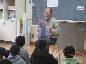 特に、3年生向けの民話のお話では、この後予定している校外学習につながるように上阿久津の「屋台」にまつわるお話を紹介していただきました。子ども達に解りやすいように写真をふんだんに用意し、語り手の方が身振り手振りの解説を加えお話をしてくれました。子ども達は真剣な表情で、メモを取りながら聞いていました。