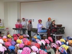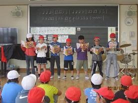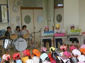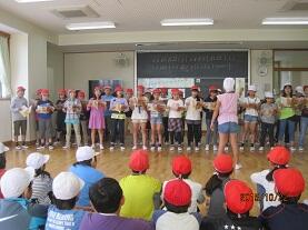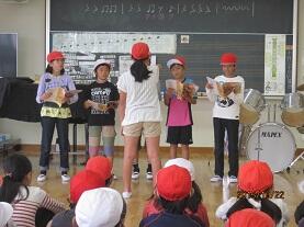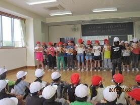 1学期間、クラブ活動の時間に取り組んできた器楽演奏「海の見える街」と歌「愛歌」を発表してくれました。「愛歌」の演奏では、音楽室に集まった皆も歌に合わせて一緒に手拍子を贈るなど、音楽室が一体となって歌声が響いていました。