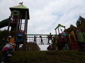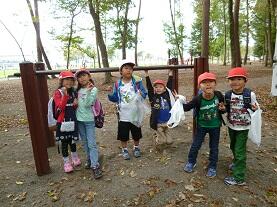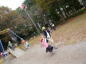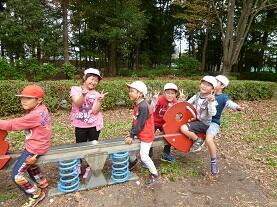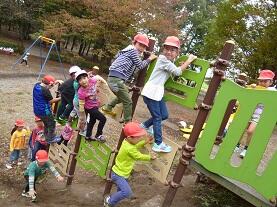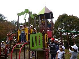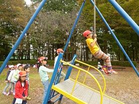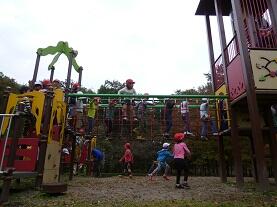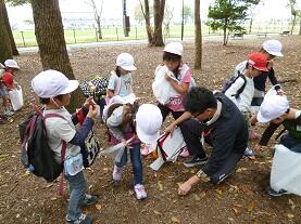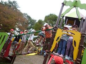 子ども達は、自然いっぱいのこの公園で秋を感じ、秋の木の実や落ち葉を集めたり、アスレチック施設では友達と仲良く思いきり遊んだりすることができました。この後、公園内で集めたドングリや木の葉でオモチャや飾りなどを作る活動が楽しみです。