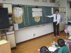 1年1組での研究授業では、多くの参観者が見守る中、道徳の授業を行いました。事前の資料の分析や掲示資料の作成などにも前向きに取り組み、児童の心情を捉えながら子ども達の考えを引き出していました。終末には、自分の体験談を話すことにより、子ども達に道徳の価値の内面化を図る様子が見られました。