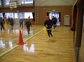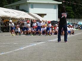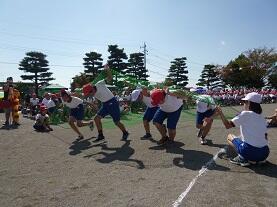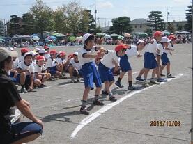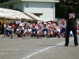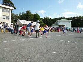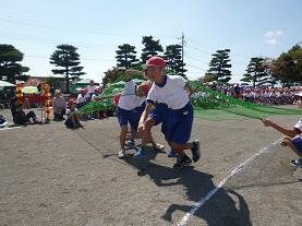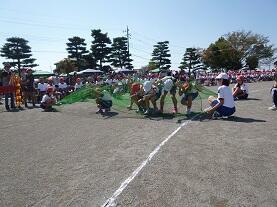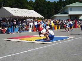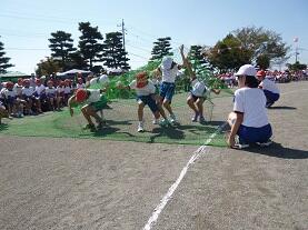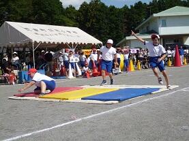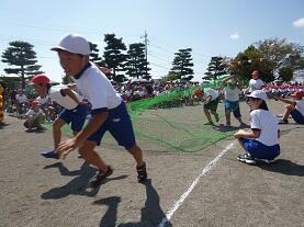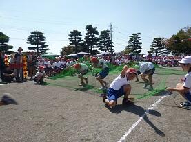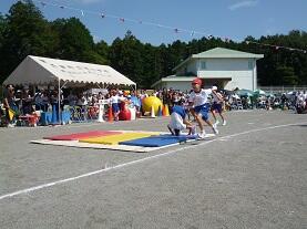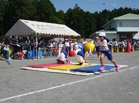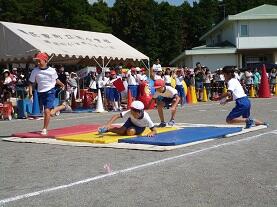 4年生は「前へ前へ」の障害走です。障害物の“ネット”に引っ掛かり、出遅れてしまった子が最後のくじ引きで、ラッキーくじを引き当て、マットでの前転等をパスしてトップでゴールする大逆転の場面も見られました。最後まで全力で取り組んでいました。