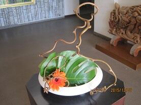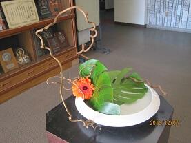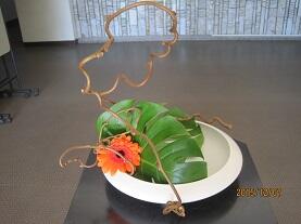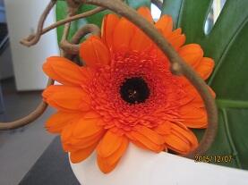 12月7日(月)の午前中に、生け花ボランティアの方が見え、色鮮やかなオレンジ色い「ガーベラ」の花と観葉植物の「モンステラ」、それに「キウイ(弦)」を玄関に生けてくださいました。