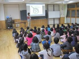 自分の今までの手の洗い方をふり返り、手の汚れやすいところの気付きや手を清潔にすることの大切さについて、調理師や医師を例に挙げて子ども達に分かりやすくお話してくれました。