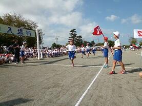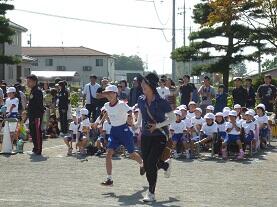 3年生は「プチ世界陸上魅せまshow!」の100m徒競走です。いつも元気印の3年生の元気さ、ひょうきんさを生かしたいと、入場の時には「マリオ」の曲に合わせて入場したり、スタートの時は思い思いにポーズを取ったりと、子ども達はノリノリでやる気満々でした。途中、激しく転倒する子や靴を飛ばしながらもめげずにゴールをめざすたくましい姿もありました。