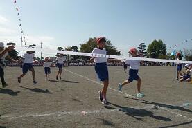 1年生は「がんばれ!ちびっこランナー」の徒競走で、ひたすら70mを全力疾走です。スタートダッシュから本気モードで、みんな真剣な表情です。途中、靴が脱げても気にせず走りきりました。