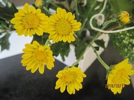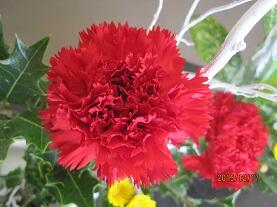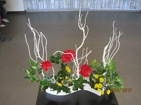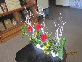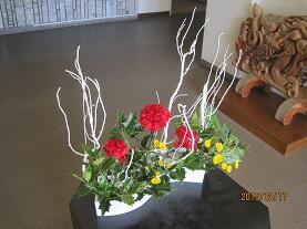 12月17日の午前中に、生け花ボランティアの方が見え、色鮮やかな赤い「カーネーション」、黄色の「小菊」の花と「ゴットセフィアナ」、「ヒイラギ」、それに白く塗った「枝」を玄関に生けてくださいました。