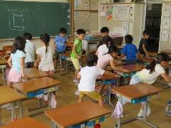 朝の活動の時間を利用し、竜巻シェルター作りの練習を行いました。担任が作り方の説明を行い、1分間以内を目標にして何度も練習しました。子どもたちは有事に備え、一生懸命取り組んでいました。(担当:岡崎教諭)