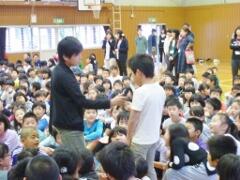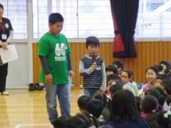 児童朝会のスタートは、「あいさつ集会委員会」の紹介です。あいさつ集会委員会は、南小があいさつのあふれる学校になるように「あいさつ運動」を毎朝行っています。