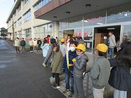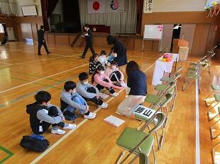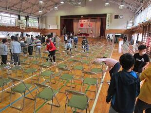 登校班編成の様子です。人数を制限し体育館で窓を