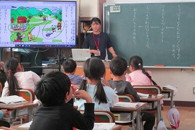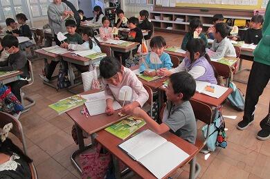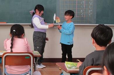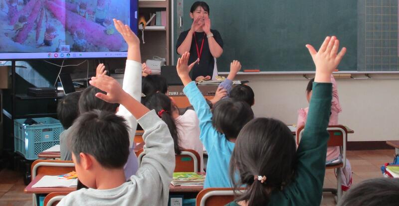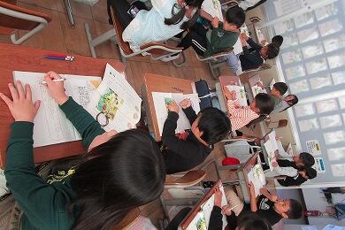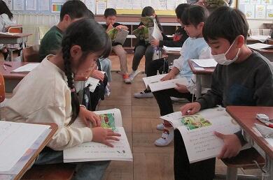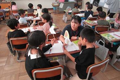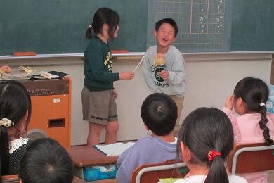 子供たちはまず、「ねずみのいもほり」というみんなが知っているお話で、ペープサートを使いながら、登場人物がどんな話をしたか想像し、物語を作る楽しさを味わいました。その後で、教科書の挿絵を見て、どんなお話ができそうか想像し、ペアで話をしたり、全体で発表したりしました。