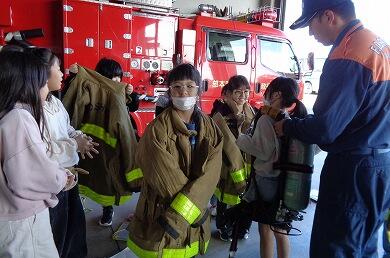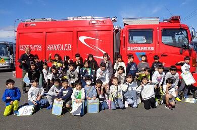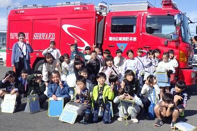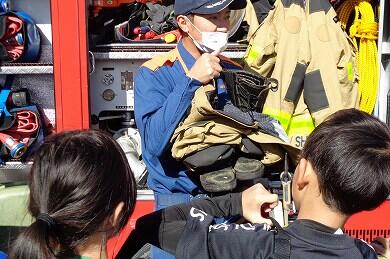 子供たちは、消防車の仕組みについての説明を聞いた上で見学したり、消防士さんが実際に着用する防火服を着させてもらったり、消防士さんの訓練の様子を見学したり・・・と、貴重な体験と学習をたくさんさせていただきました。