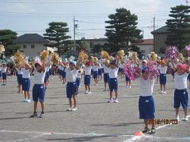 1・2年生は、“ゆず”の曲「イロトリドリ」に合わせて子どもたちがポンポンを持って可愛く元気に踊りました。振付もインターネットの動画サイトを参考にしながら、1年生と2年生の踊りのタイミングを変えたり、グループごとの踊りを入れたりと、途中にダンスの振り付けや隊形を工夫したので、覚えることが思ったよりも大変で難しく繰り返し練習をしました。曲の最後は、クラスごとの振り付けと“キメポーズ”を考え踊りました。本番では、曲に合わせてリズミカルに大きな動きを披露し、2年生はかっこよく、1年生は可愛らしさが表れたダンスになりました。子どもたちも、一番上手に踊れて大満足でした。