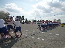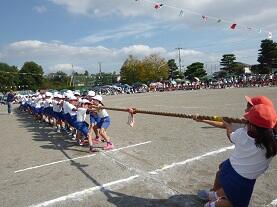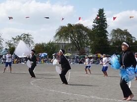ゲームの中で“ドラえもん”と“ネコ”と“ネズミ”役を決め、その“ドラえもん”を探し当ててドラえもんが苦手とする“ネズミ”役にタッチされると負けになるゲームです。偶然にも“ドラえもん”役に選ばれた児童が、ドラえもんの4次元ポケット型ポーチを付けていたので大うけでした。対戦は、両チームとも“ドラえもん”役が巧みに逃げ回り、なかなか勝負がつきませんでしたが、最後に赤組の“ドラえもん”役がネズミにタッチされ白組が勝ちました。