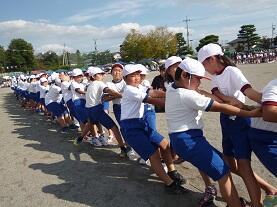 全校児童が紅白に分かれ、6つのカゴを目がけてまりを投げ入れました。全校児童が一斉にかごを目がけてまりを投げ上げる光景は圧巻です。練習の時は、コツがつかめず高学年のカゴには、数えるほどしか入っていませんでしたが、本番では作戦を立てて取り組み、全力を出して頑張っていました。
