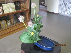 今回は、ネギボウズのような「ギガンチューム」と夏の季節に涼しげな色で咲く「ギボウシ」、そして「小ギク」を生けてくださいました。