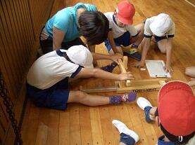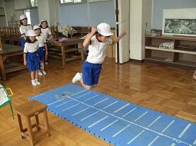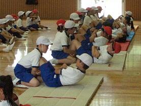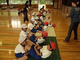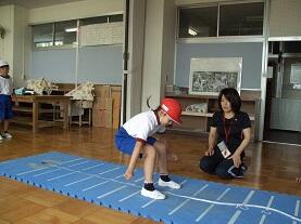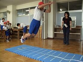 校庭では、●50m走【走る能力】、●ソフトボール投げ【投げる能力】、体育館では、●上体起こし【筋力・筋持久力:筋肉が力を出したり、筋肉が力を出し続けたりする能力】、●反復横とび【しゅんびん性:体をすばやく動かす能力】、●長座体前屈【柔軟性:体を曲げたり伸ばしたりする能力】を各学年がローテーションして実施しました。生活科室と図工室を使い●立ち幅とび【とぶ能力】を行いました。