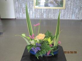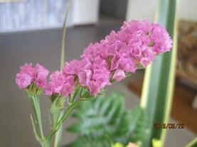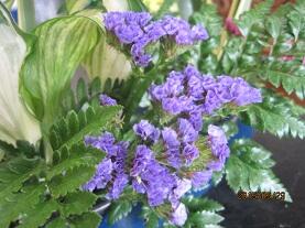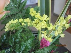先日、生け花ボランティアの方が見え、前回生けてくれた「カスミ草」と入れ替えて色とりどりの「スターチス」を生けてくださいました。玄関には、前回と違ったアレンジで「カーネーション」とピンク・黄色・紫色の「スターチス」「ギボウシ」そして、「ニューサイラン」と「レザーファン」を生けてくださいました。