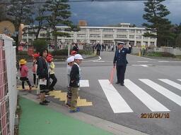 5校時目には、時折、強風が吹き桜吹雪が舞う中、“さくら警察署交通課”と“勝山駐在所”の警察官の協力をいただき、「交通安全教室」を行いました。1年生を含めた各登校班に分かれ、校庭の模擬道路と学校の周りの公道で安全な横断歩道の渡り方と歩行の仕方について学習しました。