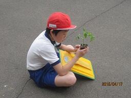 また、3年生では、今年度はトマトの栽培活動を行う予定でおりますが、昨日、カゴメ「“りりこ”わくわくプログラム」をとおしての、トマトの苗が届きました。早速、今日は、3年生の児童が、観察を開始し観察日誌に「はじめまして“りりこ”」というタイトルで、トマトの苗のスケッチをしていました。来週には、新しく設置した学年教材畑に定植する予定です。