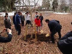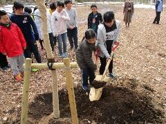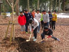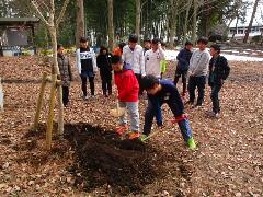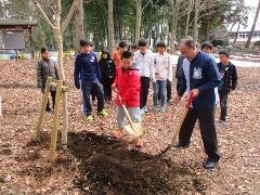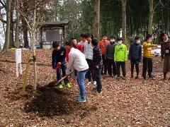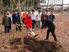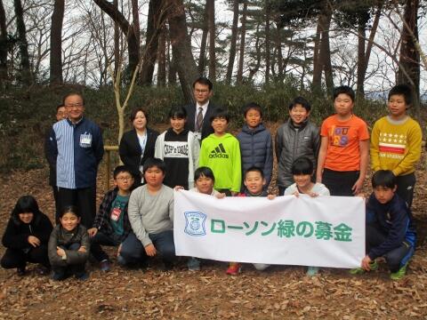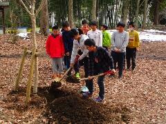 昨日ローソンの方ととちぎ環境・みどり推進機構の方を迎え、「学校環境モデル事業」の完成式典を行いました。この事業は、ローソンの各店舗にある募金の一部を活用させていただき、環境緑化の整備をするものです。南小では、「野外教室の整備」と「サザンカ・ヤマモミジ」の植樹を行いました。式典の後に環境委員の児童が記念の植樹や写真撮影をしました。今後綺麗に整備された野外教室で活用し学習することがとても楽しみな様子でした。 (担当:笠井)