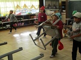 教室内にいた児童は、机やテーブルの下にもぐりました。