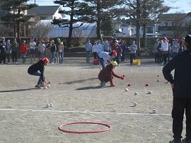 玉入れの球をフラフープの輪をめがけて投げ、点数を競います。