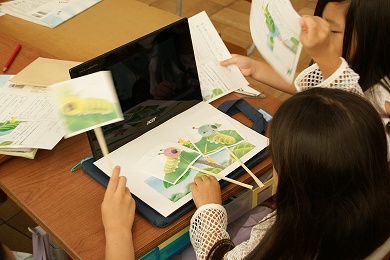 この時間は、「3匹のあおむしの気持ちを考える」ことが学習のめあてでした。そして、3匹のあおむしの会話をしている様子をタブレットの動画機能で記録していました。子供たちは、あおむしの気持ちを想像し、役になりきってお話をしていました。