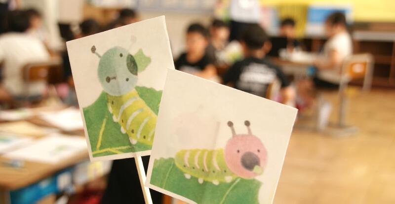 子供たちは、普段から「やさしい言葉」「元気が出る言葉」「相手のことを思っている言葉」「ニコニコ笑顔になる言葉」を使っています。そして子供たちは、広い世界ときれいな海を見た3匹のあおむしたちの会話の場面から、「一緒に、仲良く、さらに優しい気持ちになっていく様子」を感じ取っていたようです。