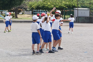 ティーボールの一番の楽しみはバッティングです!止まっているボールを打つのは簡単そうに見えますが、結構難しいようです。子供たちは経験を重ねるうちに、上手にボールを打って攻めたり、得点をされないようにボールを捕って守ったりすることができるようになってきました。