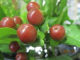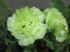 11月25日に、生け花ボランティアの方が見え、色鮮やかな黄色の「ガーベラ」と白い「カーネーション」の花、それに観葉植物の「ソリダコ」「レザーファン」と「レモンリーフ」、それから赤い実を付けた「ヒペリカム」を玄関に生けてくださいました。いつもいつも、ありがとうございます。