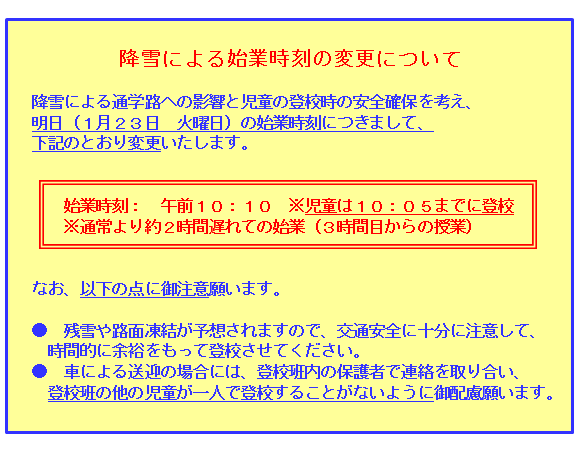 明日の朝は、降雪・積雪の予報のため2時間遅れの登校とします。集合場所も、2時間遅れの集合となります。