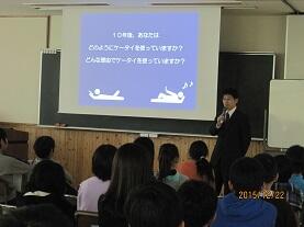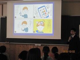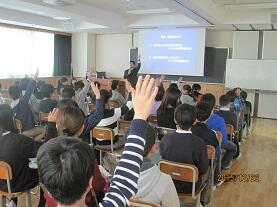情報モラル教育として「ケータイと向き合う準備をしよう」の題材名で携帯電話やスマートフォン等の危険性やインターネットの安全な利用法について、保護者と共に学ぶ機会といたしました。資料や映像等を使っての子ども達に考えさせる活動も取り入れながら、分かりやすく携帯電話のマナーや情報化が進む社会での適切な生き方などについて教えてくださいました。これから携帯電話を使う機会が増える子どもたちにとって必要不可欠な情報でした。