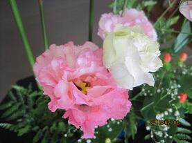 今回は、涼しげな色合いの「トルコキキョウ」と「カスミ草」、アクセントに「ヒペリカム」の花が生けられ、さらに「ガマの穂」と「レザーファン」が添えられていました。