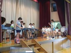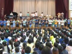 6年生は、「とびらを開いて」の合唱と「ゴジラのテーマ」を合奏しました。ゴジラの曲が流れると、下級生は、興味深そうに耳を傾けていました。