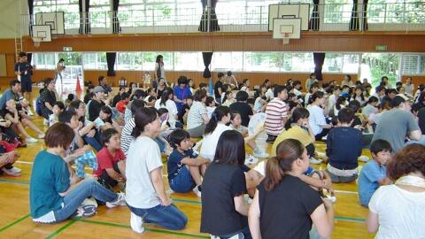 学校開放日の4校時、4年生は親子学習会でダブルドッジボールをしました。