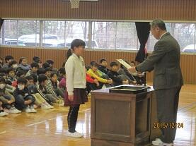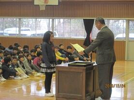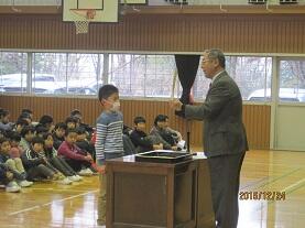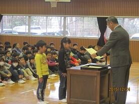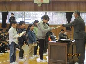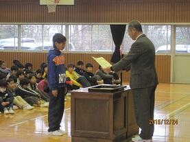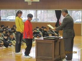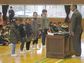 学校長より賞状・認定証を手渡し、その栄光を称えました。最後に、呼名された時に『ハイ!!』と飛切り大きな返事で表彰を受けた児童を称え、自信を持って返事することや自分の考えを述べることの大切さについて話し、益々の活躍を期待しました。