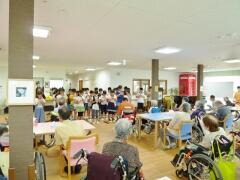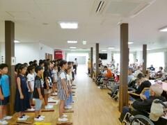 歌やリコーダー演奏を披露した後、グループごとに作成したメッセージカードをおじいさんやおばあさんにプレゼントしました。