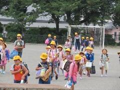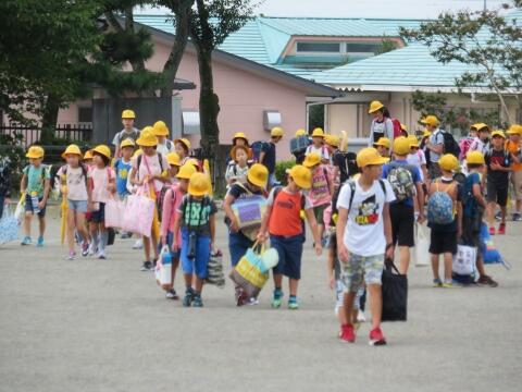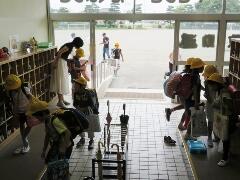 子どもたちは、荷物をたくさん持って元気に登校してきました。