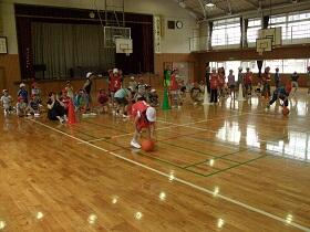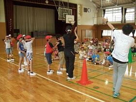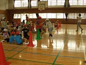 今回のプログラムは、中腰の姿勢で行うために、脚力をけっこう使うプログラム「ボールころがしリレー」を行いました。ルールは簡単、床のボールを中腰になり両手でころがしながら運びリレーをするものです。人数が足りない班に先生方も加わりプログラムは大盛り上がりでした。