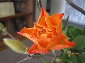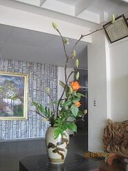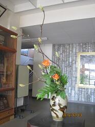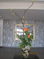 12日の午後、生け花ボランティアの方が見え、オレンジ色の「バラ」と「白モクレン(蕾)」、観葉植物の「クッカバラ」を玄関に生けてくださいました。