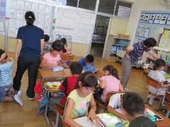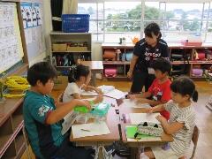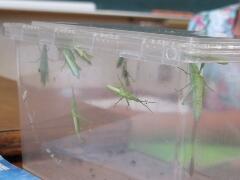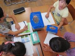 3年生の理科の授業の様子です。グループごとに、学校で捕まえてきた生き物を細かに観察しました。二人の先生がチームを組んで指導をしています。きめ細かな授業が展開されていました。