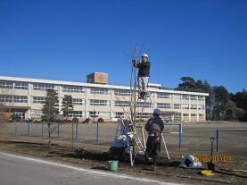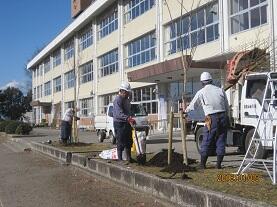 今日は、造園業者さんにより6本の苗木が植付けられました。品種は「ヤマザクラ」「カワズザクラ」「エドヒガン」です。校庭の南側に「カワズザクラ」2本、昇降口脇に「ヤマザクラ」2本、駐車場奥の南の森に「ヤマザクラ」1本、そして、中庭に「エドヒガン」1本の桜の苗木が植樹されました。今は、3メートル程の苗木ですが、これらの苗木も数年後にはすばらしい花が咲き、「シダレザクラ」や「オオシマザクラ」とともに子ども達の成長を見守ってくれることでしょう。