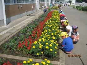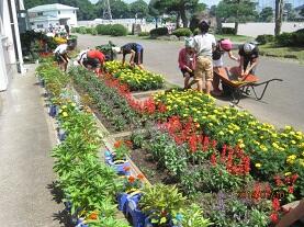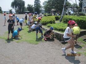 7月10日には、梅雨の中休みで蒸し暑い中でしたが、各学年の花壇と人権の花の花壇、そして、校庭の石拾い+除草活動を行いました。各学年の分担場所に分かれての作業を行いましたが、子ども達は、暑さや雑草に負けない意気ごみで、グリーン活動を行いました。