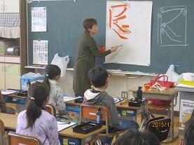 今回は「木」の字のまとめの授業で、まず、今まで習ってきた「縦画」や「横画」などのポイントを復習しながら「右払い」「左払い」の始筆・送筆・終筆について復習し、その後、始筆や「払い」の穂先の通り道と最後の筆圧をご指導いただきながら、2枚の「木」の字を書きあげました。子どもたちは、先生の一言・一挙一動を確認しながら真剣に取り組んでいました。最後に、自分で選んだ作品に名前を入れて完成させました。