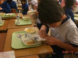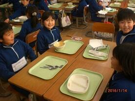 1月14日の給食は、「交流給食」でした。担任を持っていない職員が計画的に各教室に行って子どもたちとの会食を行う「交流給食」も今回が最終回となってしまいました。