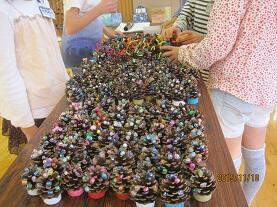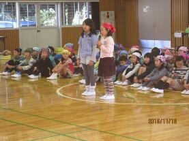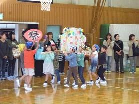 2年生は今までの生活科の時間に「子ども祭り」の計画を立て、自分たちで考えたゲームやお店などの体験コーナーの準備や品物などの用意をしてきました。2・3校時を使い、1年生や保護者も招待し「子ども祭り」を実施しました。1年生や保護者に「買い物・ゲーム券」を発行し、スタンプを押してもらいながらお店を回っていくというやり方をとりました。秋の射的屋コーナー・コロコロ秋のボーリングコーナー・どんぐり迷路屋など楽しい遊びやかわいいお店屋さんの自作アクセサリーなど、南の森などで集めたどんぐりや松ぼっくりを使い丁寧に仕上げた飾り物に1年生も大喜びでした。2年生が、お兄さん・お姉さん役となり、お祭りにふさわしい歌やお神輿の披露や各コーナーの説明や運営などで1年生をもてなす様子が微笑ましく見えました。