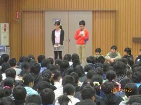 今朝は、図書委員会の企画・運営による「児童朝会」が行われました。図書委員会ではパワーポイントのプレゼン資料をもとに、今年新しく設置された「季節の実コーナー」の紹介とそのコーナーの中から12月の季節の実コーナーのおすすめの本の紹介を、途中「3択クイズ」を取り入れながら行いました。